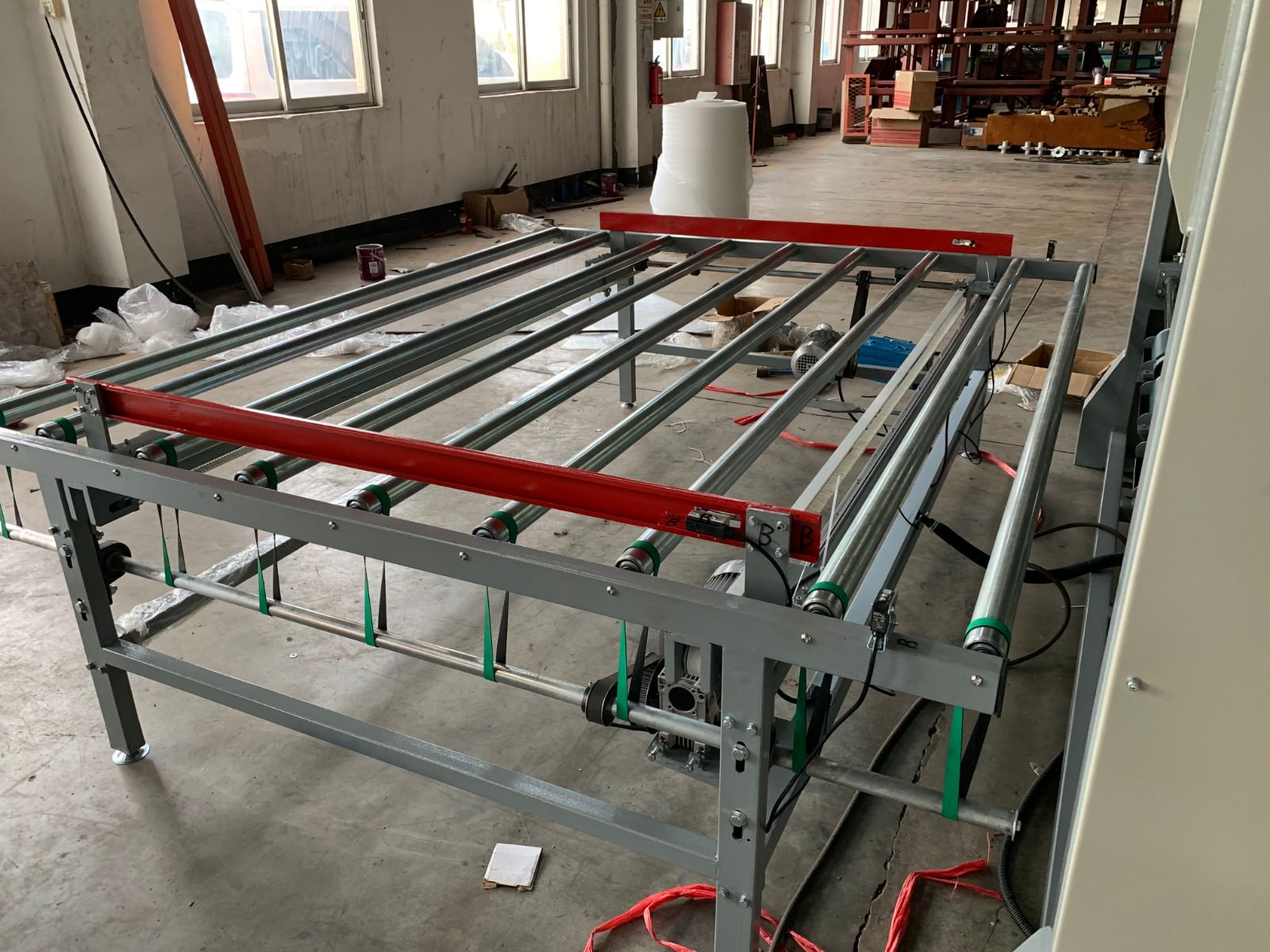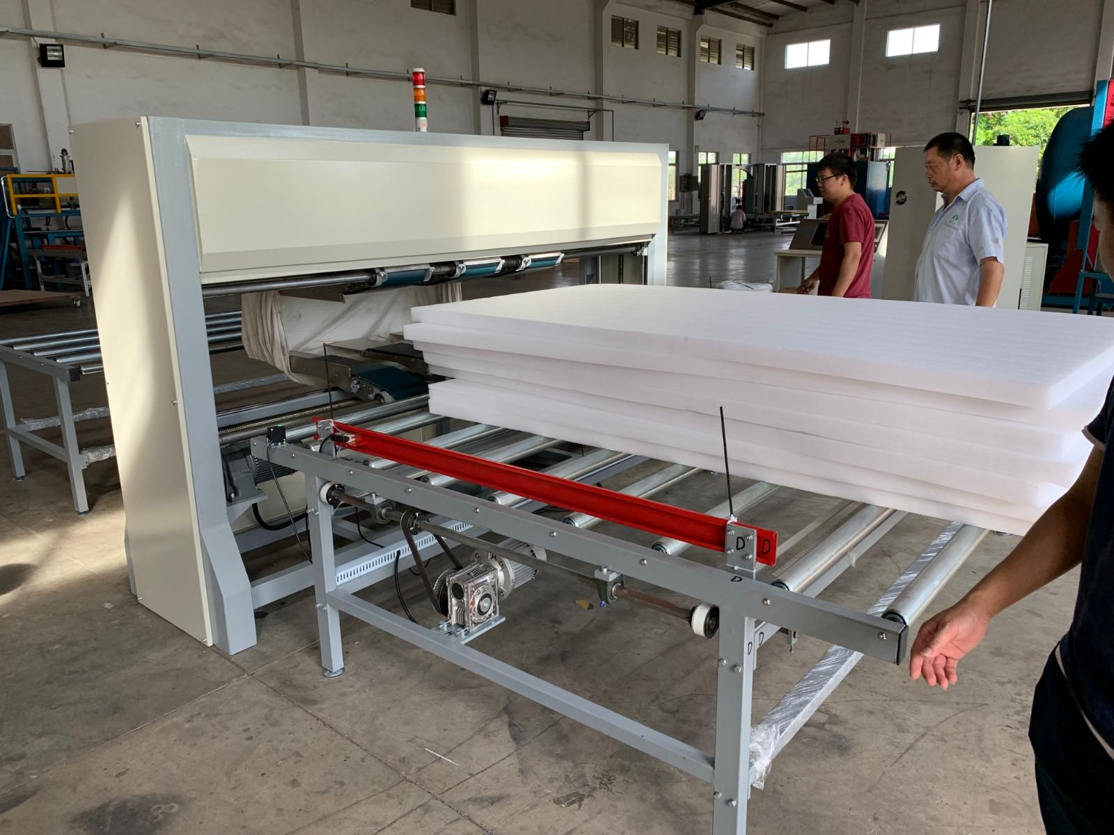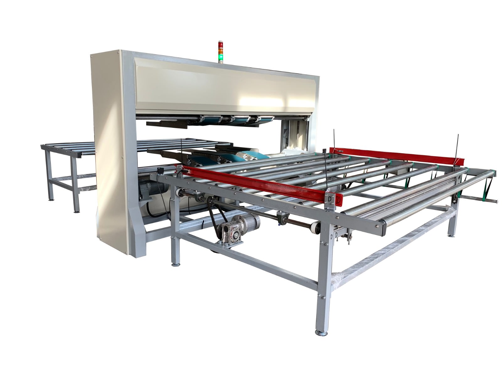 套臂的高度和寬度均采用電動(dòng)調(diào)節(jié)控制,進(jìn)料工作臺(tái)設(shè)有由氣缸驅(qū)動(dòng)的導(dǎo)正裝置,在床墊進(jìn)料工作臺(tái)輸送進(jìn)套臂前進(jìn)行導(dǎo)正,確保床墊準(zhǔn)確不偏斜、順暢地輸送到套臂中