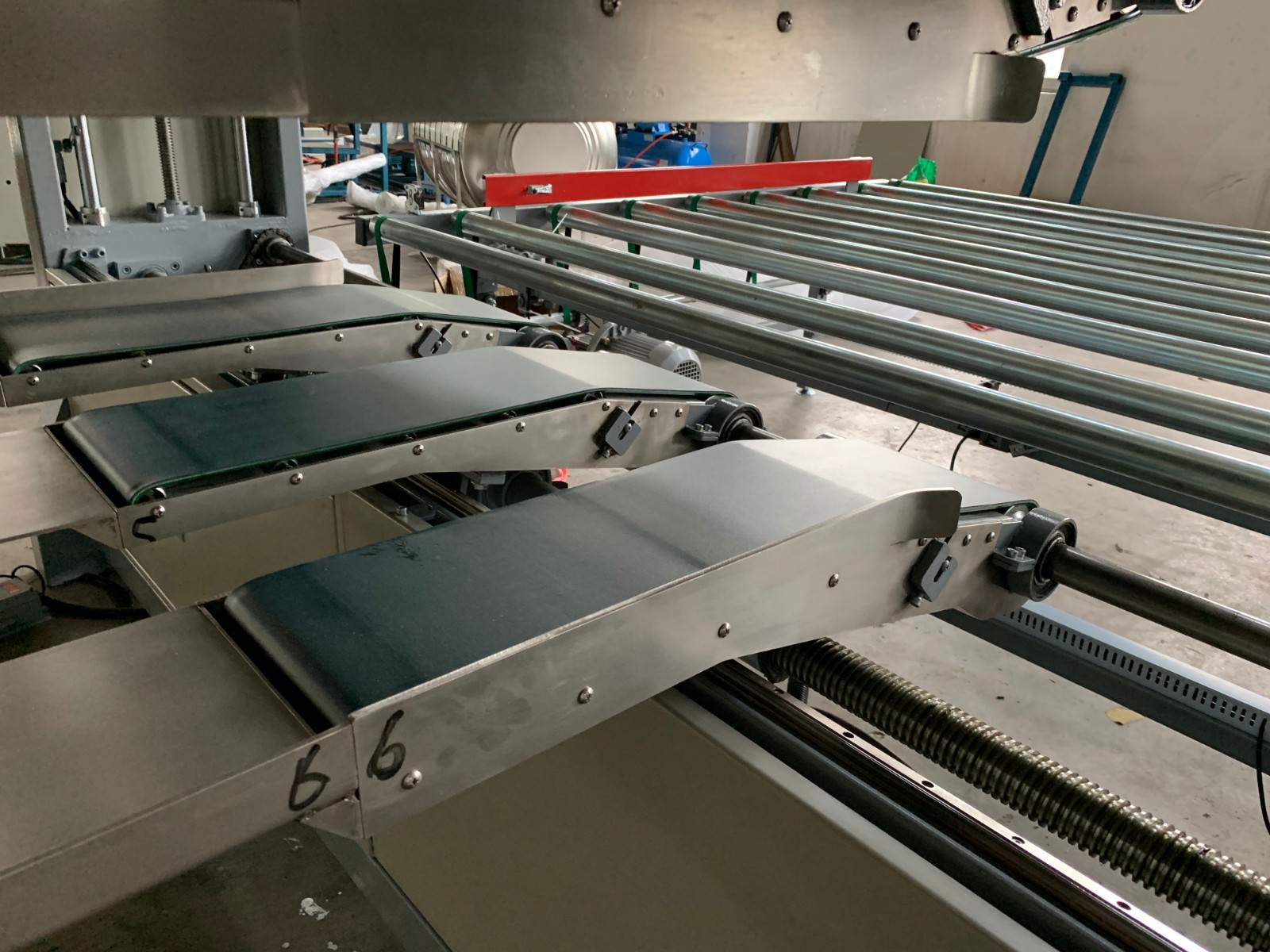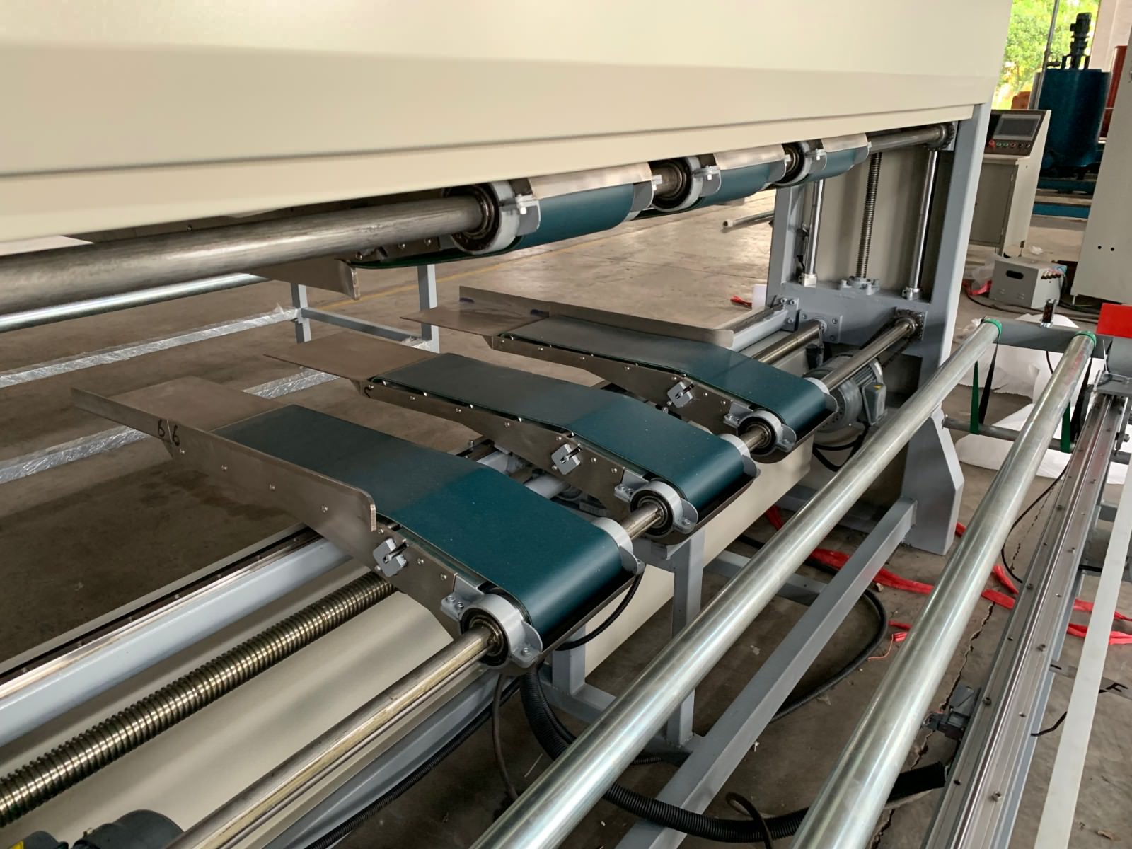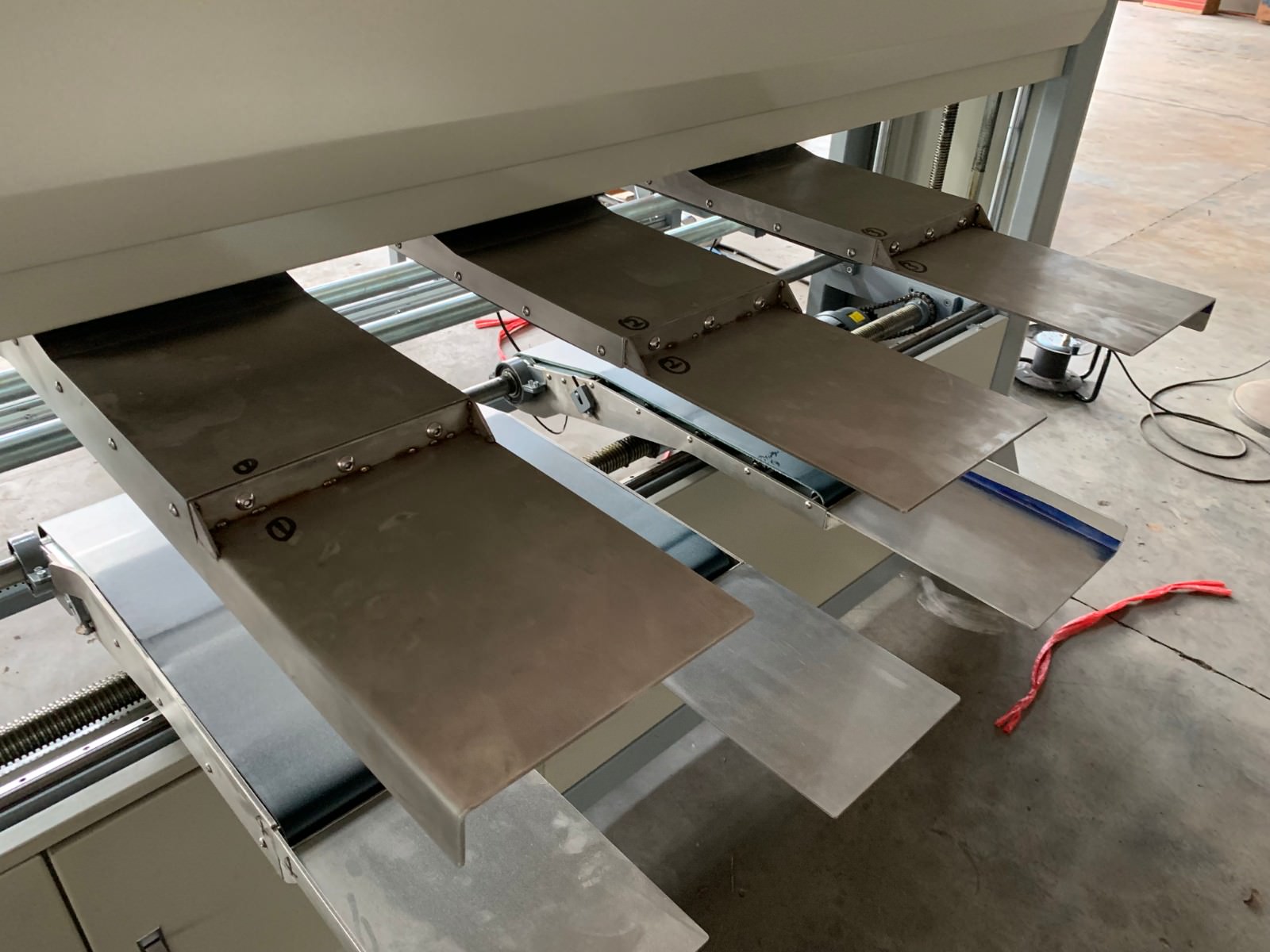 套臂的高度和寬度均采用電動(dòng)調(diào)節(jié)控制,進(jìn)料工作臺(tái)設(shè)有由氣缸驅(qū)動(dòng)的導(dǎo)正裝置,在床墊進(jìn)料工作臺(tái)輸送進(jìn)套臂前進(jìn)行導(dǎo)正,確保床墊準(zhǔn)確不偏斜、順暢地輸送到套臂中